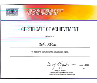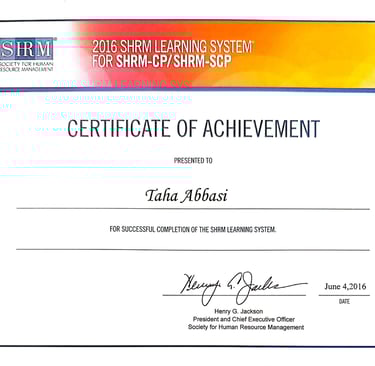 SHRM-CP(Completed in 2016), Results Certified Coach, Certified Trainer, Certified Personal Trainer (CPT) & Nutrition Coach by ISSA.